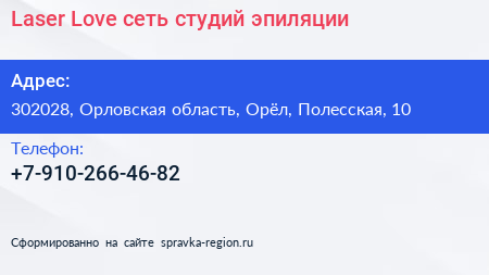 Laser Love, сеть студий эпиляции по адресу 302028, Орловская область, Орёл, Полесская, 10 в дальнейшем Организация, размещена в следующих категориях: