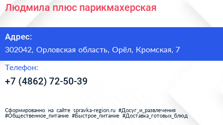 Людмила плюс, парикмахерская по адресу 302042, Орловская область, Орёл, Кромская, 7 в дальнейшем Организация, размещена в следующих категориях: