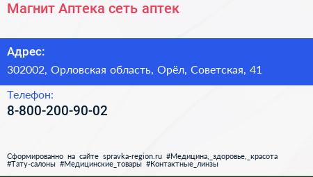 Магнит Аптека, сеть аптек по адресу 302002, Орловская область, Орёл, Советская, 41 в дальнейшем Организация, размещена в следующих категориях: