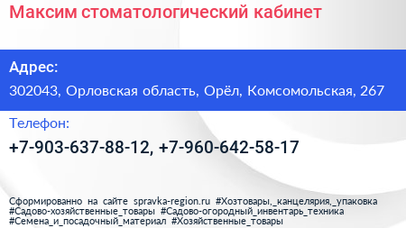 Максим, стоматологический кабинет по адресу 302043, Орловская область, Орёл, Комсомольская, 267 в дальнейшем Организация, размещена в следующих категориях:
