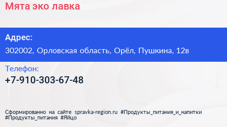 Мята, эко-лавка по адресу 302002, Орловская область, Орёл, Пушкина, 12в в дальнейшем Организация, размещена в следующих категориях: