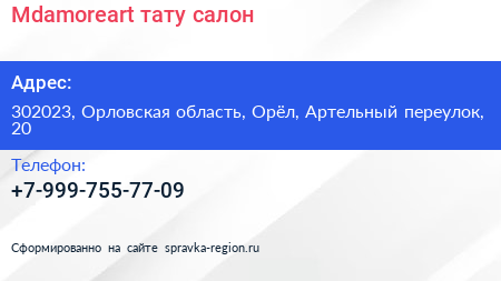 Mdamoreart, тату-салон по адресу 302023, Орловская область, Орёл, Артельный переулок, 20 в дальнейшем Организация, размещена в следующих категориях: