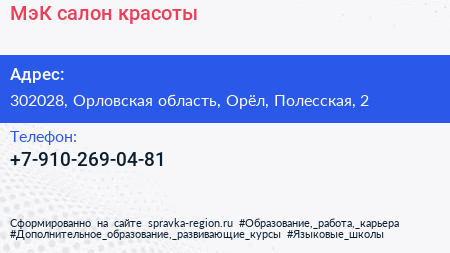 МэК, салон красоты по адресу 302028, Орловская область, Орёл, Полесская, 2 в дальнейшем Организация, размещена в следующих категориях: