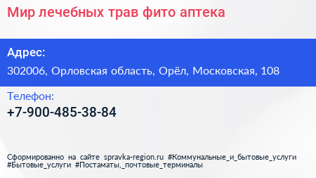 Мир лечебных трав, фито-аптека по адресу 302006, Орловская область, Орёл, Московская, 108 в дальнейшем Организация, размещена в следующих категориях: