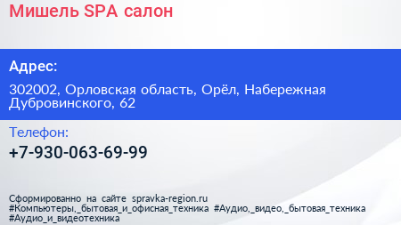 Мишель, SPA-салон по адресу 302002, Орловская область, Орёл, Набережная Дубровинского, 62 в дальнейшем Организация, размещена в следующих категориях: