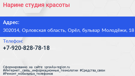 Нарине, студия красоты по адресу 302014, Орловская область, Орёл, бульвар Молодёжи, 18 в дальнейшем Организация, размещена в следующих категориях: