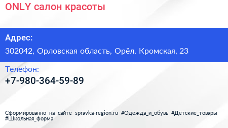 ONLY, салон красоты по адресу 302042, Орловская область, Орёл, Кромская, 23 в дальнейшем Организация, размещена в следующих категориях: