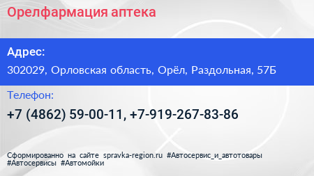 Орелфармация, аптека по адресу 302029, Орловская область, Орёл, Раздольная, 57Б в дальнейшем Организация, размещена в следующих категориях: