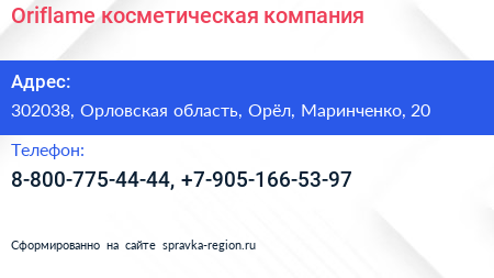 Oriflame, косметическая компания по адресу 302038, Орловская область, Орёл, Маринченко, 20 в дальнейшем Организация, размещена в следующих категориях: