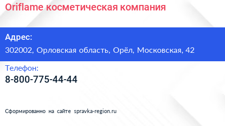Oriflame, косметическая компания по адресу 302002, Орловская область, Орёл, Московская, 42 в дальнейшем Организация, размещена в следующих категориях: