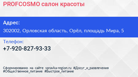 PROFCOSMO, салон красоты по адресу 302002, Орловская область, Орёл, площадь Мира, 5 в дальнейшем Организация, размещена в следующих категориях:
