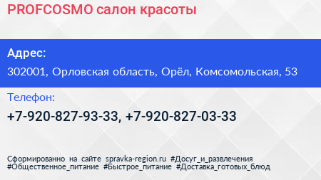 PROFCOSMO, салон красоты по адресу 302001, Орловская область, Орёл, Комсомольская, 53 в дальнейшем Организация, размещена в следующих категориях: