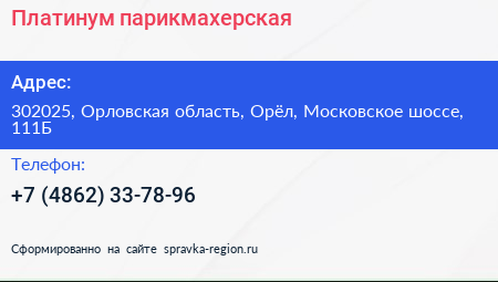 Платинум, парикмахерская по адресу 302025, Орловская область, Орёл, Московское шоссе, 111Б в дальнейшем Организация, размещена в следующих категориях:
