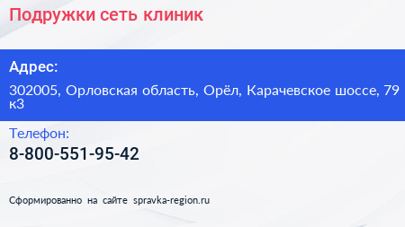 Подружки, сеть клиник по адресу 302005, Орловская область, Орёл, Карачевское шоссе, 79 к3 в дальнейшем Организация, размещена в следующих категориях: