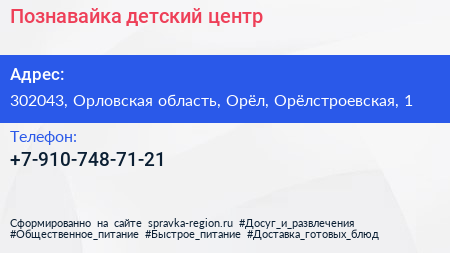 Познавайка, детский центр по адресу 302043, Орловская область, Орёл, Орёлстроевская, 1 в дальнейшем Организация, размещена в следующих категориях: