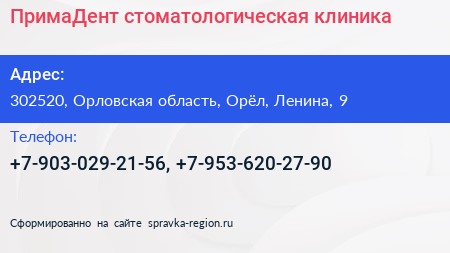 ПримаДент, стоматологическая клиника по адресу 302520, Орловская область, Орёл, Ленина, 9 в дальнейшем Организация, размещена в следующих категориях: