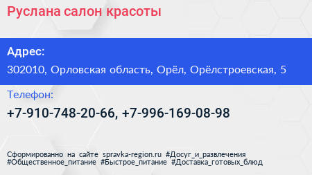 Руслана, салон красоты по адресу 302010, Орловская область, Орёл, Орёлстроевская, 5 в дальнейшем Организация, размещена в следующих категориях: