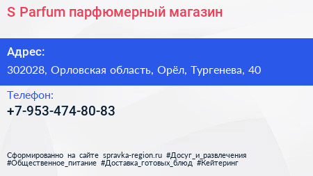 S-Parfum, парфюмерный магазин по адресу 302028, Орловская область, Орёл, Тургенева, 40 в дальнейшем Организация, размещена в следующих категориях: