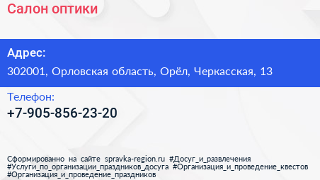Салон оптики по адресу 302001, Орловская область, Орёл, Черкасская, 13 в дальнейшем Организация, размещена в следующих категориях: