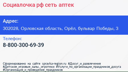 Социалочка.рф, сеть аптек по адресу 302028, Орловская область, Орёл, бульвар Победы, 3 в дальнейшем Организация, размещена в следующих категориях: