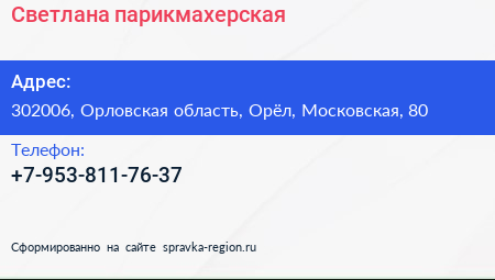 Светлана, парикмахерская по адресу 302006, Орловская область, Орёл, Московская, 80 в дальнейшем Организация, размещена в следующих категориях: