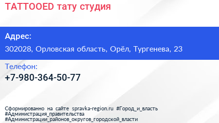 TATTOOED, тату-студия по адресу 302028, Орловская область, Орёл, Тургенева, 23 в дальнейшем Организация, размещена в следующих категориях: