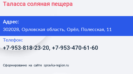 Таласса, соляная пещера по адресу 302028, Орловская область, Орёл, Полесская, 11 в дальнейшем Организация, размещена в следующих категориях: