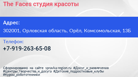 The Faces, студия красоты по адресу 302001, Орловская область, Орёл, Комсомольская, 13Б в дальнейшем Организация, размещена в следующих категориях: