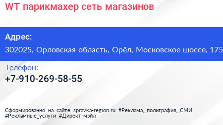 WT-парикмахер, сеть магазинов по адресу 302025, Орловская область, Орёл, Московское шоссе, 175 в дальнейшем Организация, размещена в следующих категориях: