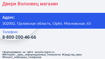 Двери Волховец, магазин по адресу 302002, Орловская область, Орёл, Московская, 63 в дальнейшем Организация, размещена в следующих категориях: