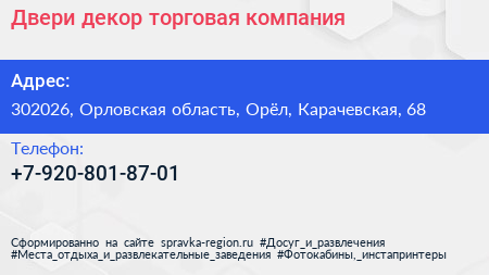 Двери декор, торговая компания по адресу 302026, Орловская область, Орёл, Карачевская, 68 в дальнейшем Организация, размещена в следующих категориях:
