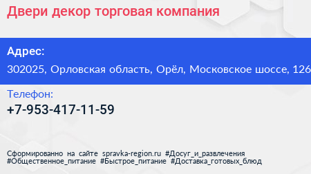 Двери декор, торговая компания по адресу 302025, Орловская область, Орёл, Московское шоссе, 126 в дальнейшем Организация, размещена в следующих категориях: