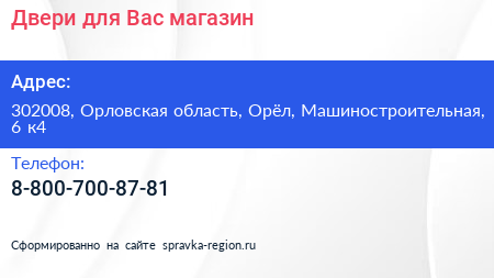 Двери для Вас, магазин по адресу 302008, Орловская область, Орёл, Машиностроительная, 6 к4 в дальнейшем Организация, размещена в следующих категориях:
