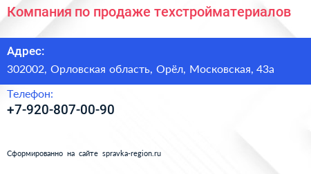 Компания по продаже техстройматериалов по адресу 302002, Орловская область, Орёл, Московская, 43а в дальнейшем Организация, размещена в следующих категориях: