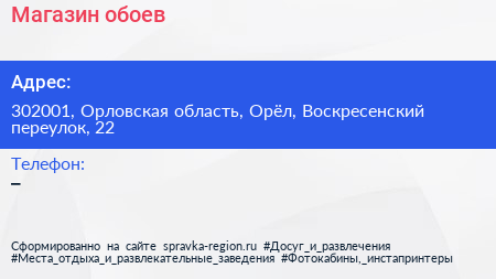 Магазин обоев по адресу 302001, Орловская область, Орёл, Воскресенский переулок, 22 в дальнейшем Организация, размещена в следующих категориях: