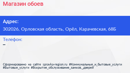 Магазин обоев по адресу 302026, Орловская область, Орёл, Карачевская, 68Б в дальнейшем Организация, размещена в следующих категориях: