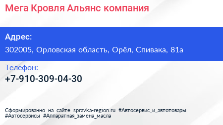 Мега Кровля Альянс, компания по адресу 302005, Орловская область, Орёл, Спивака, 81а в дальнейшем Организация, размещена в следующих категориях:
