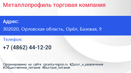 Металлопрофиль, торговая компания по адресу 302020, Орловская область, Орёл, Базовая, 9 в дальнейшем Организация, размещена в следующих категориях: