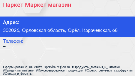 Паркет-Маркет, магазин по адресу 302026, Орловская область, Орёл, Карачевская, 68 в дальнейшем Организация, размещена в следующих категориях: