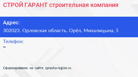 СТРОЙ ГАРАНТ, строительная компания по адресу 302023, Орловская область, Орёл, Михалицына, 5 в дальнейшем Организация, размещена в следующих категориях: