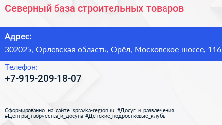 Северный, база строительных товаров по адресу 302025, Орловская область, Орёл, Московское шоссе, 116 в дальнейшем Организация, размещена в следующих категориях: