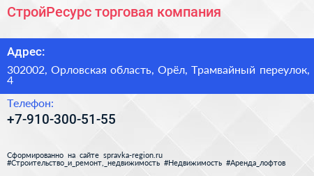 СтройРесурс, торговая компания по адресу 302002, Орловская область, Орёл, Трамвайный переулок, 4 в дальнейшем Организация, размещена в следующих категориях: