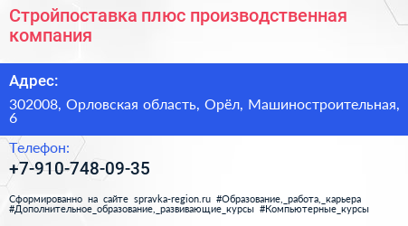 Стройпоставка-плюс, производственная компания по адресу 302008, Орловская область, Орёл, Машиностроительная, 6 в дальнейшем Организация, размещена в следующих категориях: