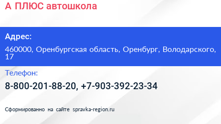 А-ПЛЮС, автошкола по адресу 460000, Оренбургская область, Оренбург, Володарского, 17 в дальнейшем Организация, размещена в следующих категориях:
