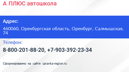 А-ПЛЮС, автошкола по адресу 460060, Оренбургская область, Оренбург, Салмышская, 74 в дальнейшем Организация, размещена в следующих категориях: