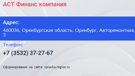 АСТ-Финанс, компания по адресу 460036, Оренбургская область, Оренбург, Авторемонтная, 3 в дальнейшем Организация, размещена в следующих категориях:
