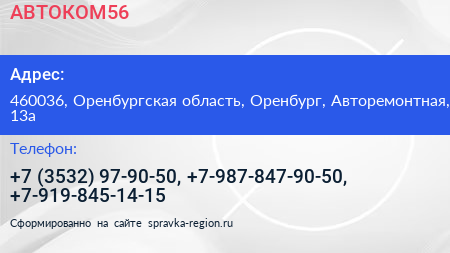 АВТОКОМ56 по адресу 460036, Оренбургская область, Оренбург, Авторемонтная, 13а в дальнейшем Организация, размещена в следующих категориях: