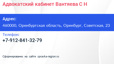 Адвокатский кабинет Вантяева С.Н. по адресу 460000, Оренбургская область, Оренбург, Советская, 23 в дальнейшем Организация, размещена в следующих категориях: