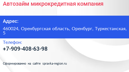 Автозайм, микрокредитная компания по адресу 460024, Оренбургская область, Оренбург, Туркестанская, 5 в дальнейшем Организация, размещена в следующих категориях: