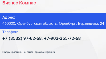 Бизнес-Компас по адресу 460000, Оренбургская область, Оренбург, Бурзянцева, 24 в дальнейшем Организация, размещена в следующих категориях:
